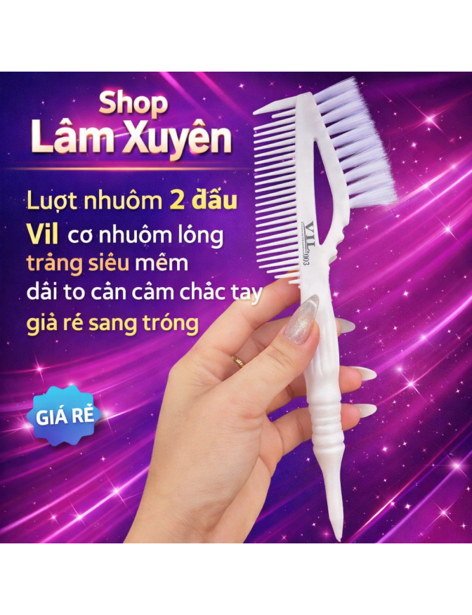 Lượt nhuộm 2 đầu Vil – Cọ nhuộm lông trắng siêu mềm Thiết kế 2 đầu tiện lợi: dễ dàng nhuộm tóc đều màu, tiết kiệm thời gian. Lông cọ trắng siêu mềm, dài và to: bám thuốc tốt, thoa đều, không làm đau da đầu. Cán cầm chắc tay, chất liệu bền, dễ thao tác cho thợ salon và cả người dùng tại nhà. Kiểu dáng sang trọng – giá rẻ, phù hợp mọi nhu cầu nhuộm tóc chuyên nghiệp.
